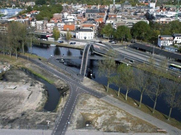 Mientras que la pasarela se separa hacia los laterales para el paso de los ciclistas, el cambio de nivel se ofrece al peatón con un elegante arco de medio punto permitiendo unas vistas sin igual de la ciudad y del paisaje holandés.