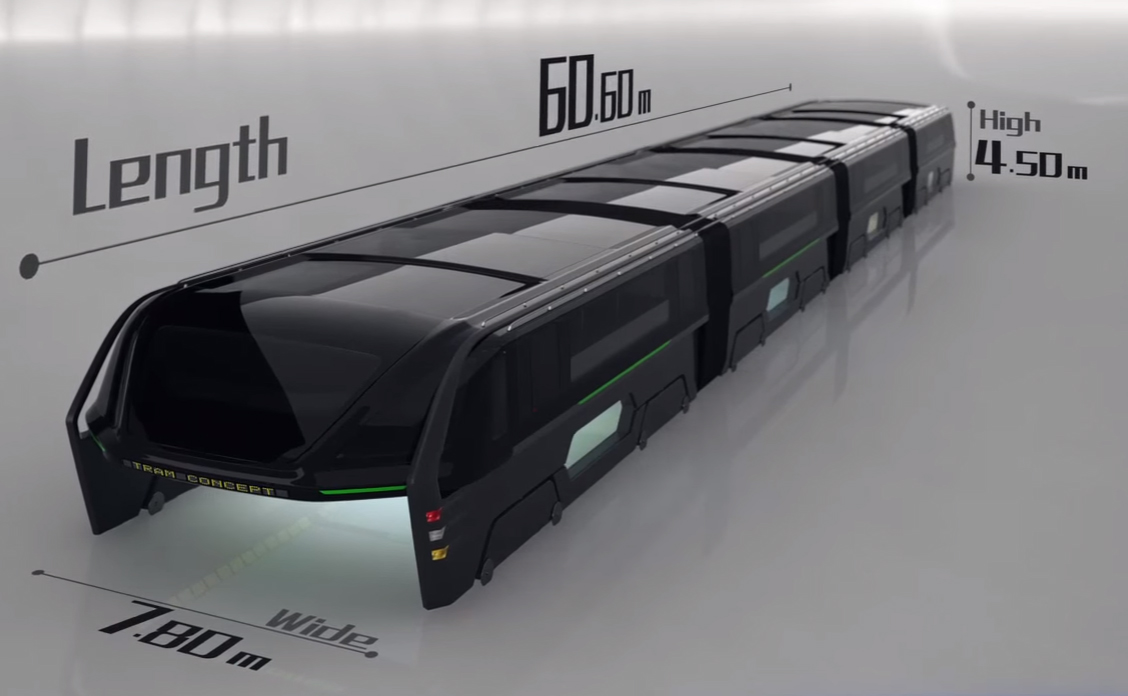 La velocidad media del TEB estaría en los 40 Km/horas kilómetros con una capacidad de transporte de unos 1.200 pasajeros. Tendrá unas dimensiones de 60,60 metros de largo, 7,80 metros de ancho y 4,5 metros de altura (2,2 metros de espacio para los coches y 2,4 metros de altura para la cabina de pasajeros).