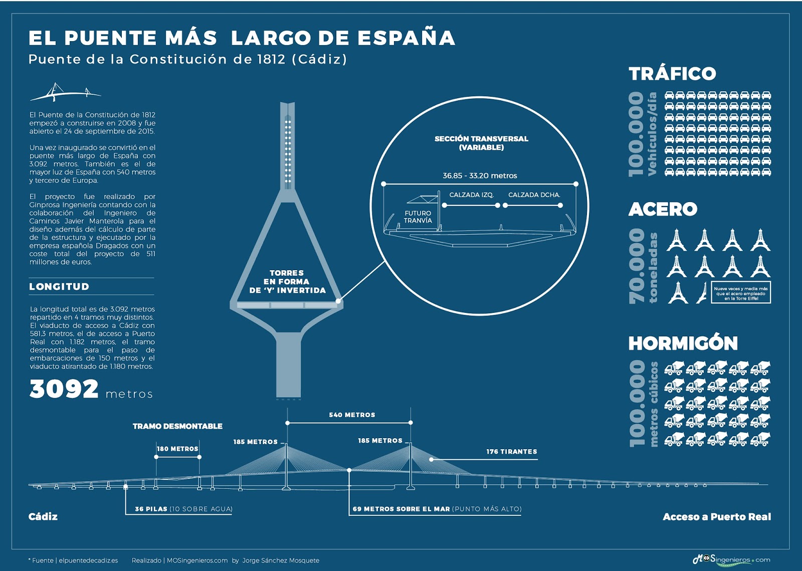 Hoy os traemos una infografía que hemos elaborado para acercaros el Puente más largo de España. Se trata del Puente de la Constitución de 1812 ubicado en Cádiz y hace unos cuantos años ya os hablamos de el. Este colosal ‘made in Spain’, fue redactado por Gimprosa Ingeniería, quién contó con la colaboración del ingeniero de Caminos navarro Javier Manterola para el diseño además del cálculo de parte de la estructura y ejecutado por la empresa española Dragados con un coste total de 511 millones de euros.